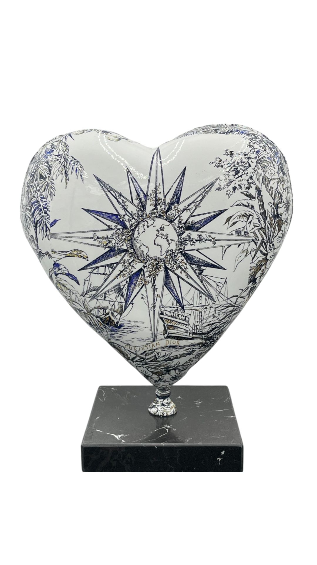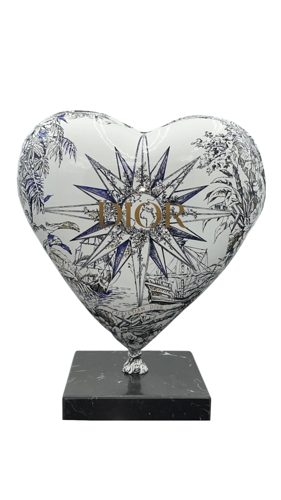 Cuore Dior della collezione Naor Art Design, un’opera d’arte in resina con dettagli di lusso e base in marmo. Perfetto per collezionisti e amanti dell’alta moda.