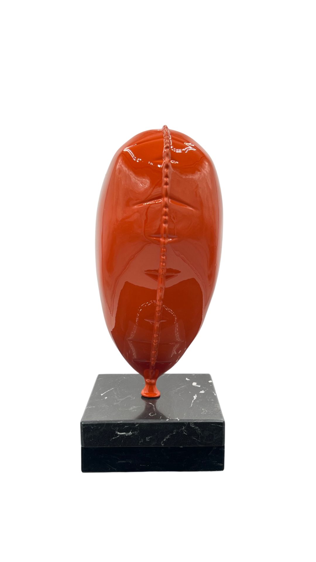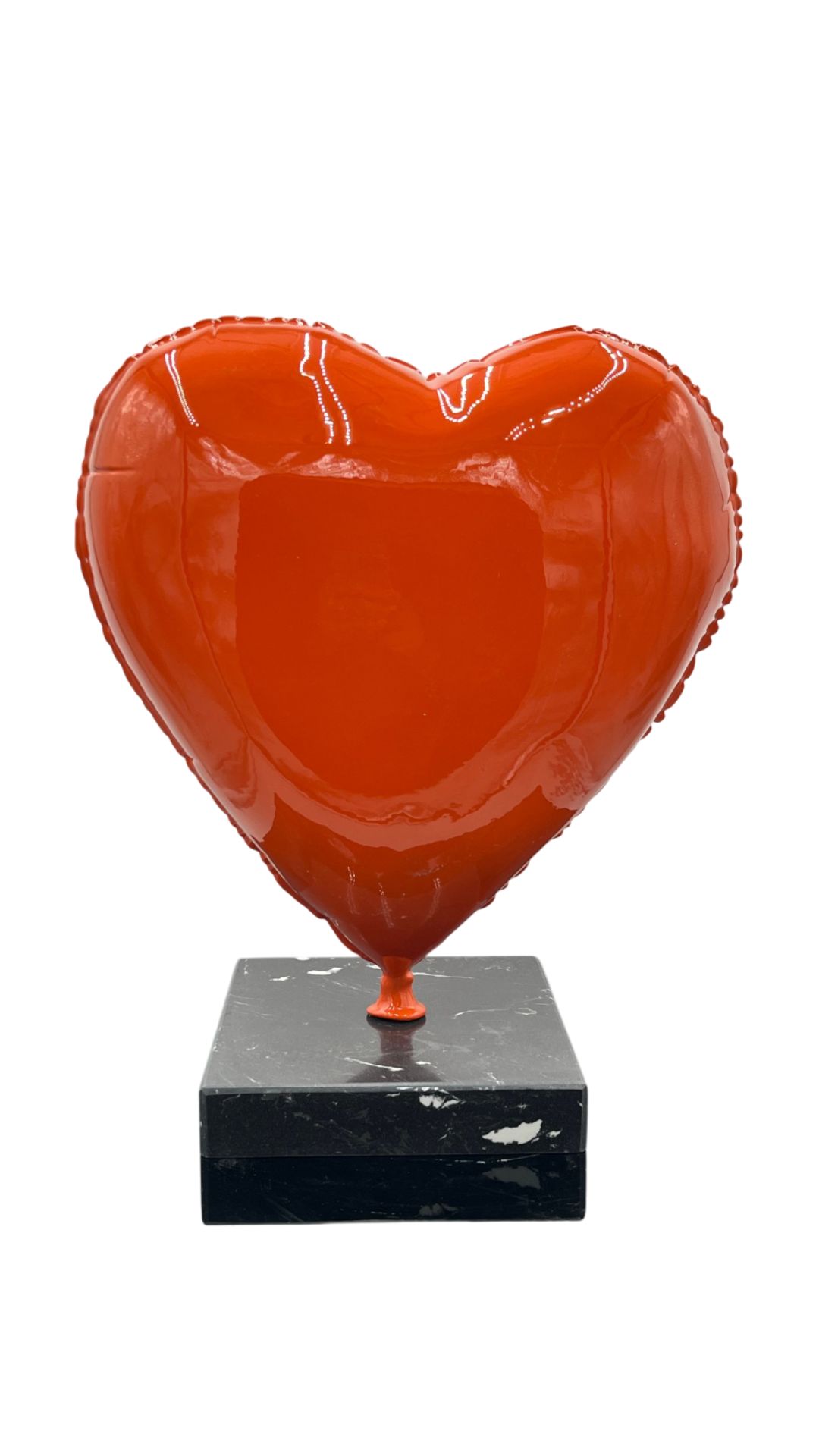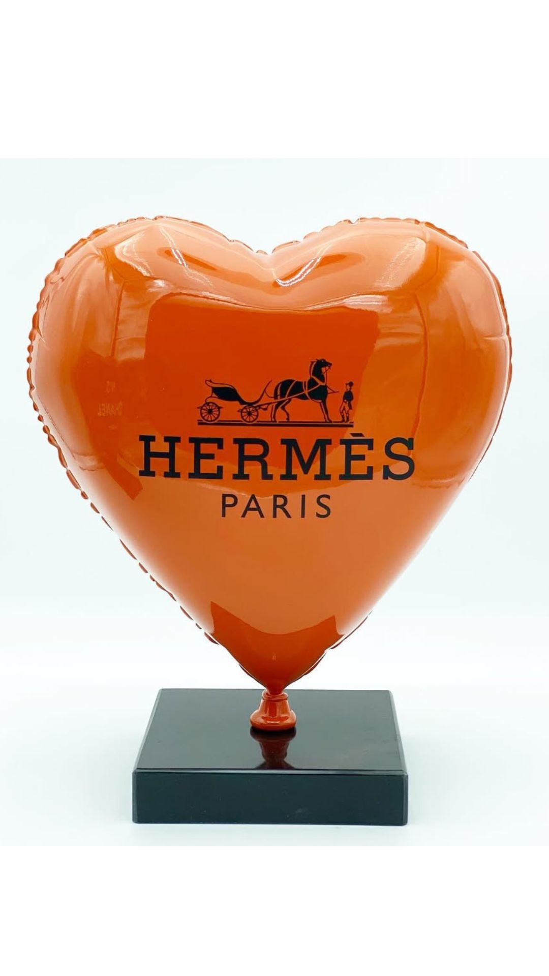 Questa scultura Naor si distingue per la sua forma a cuore che richiama un palloncino, realizzata nell'inconfondibile arancione Hermès con una finitura lucida che crea affascinanti giochi di luce. Il logo storico con la carrozza e il cavallo, riprodotto in nero intenso, aggiunge un elemento di autenticità e prestigio al design.