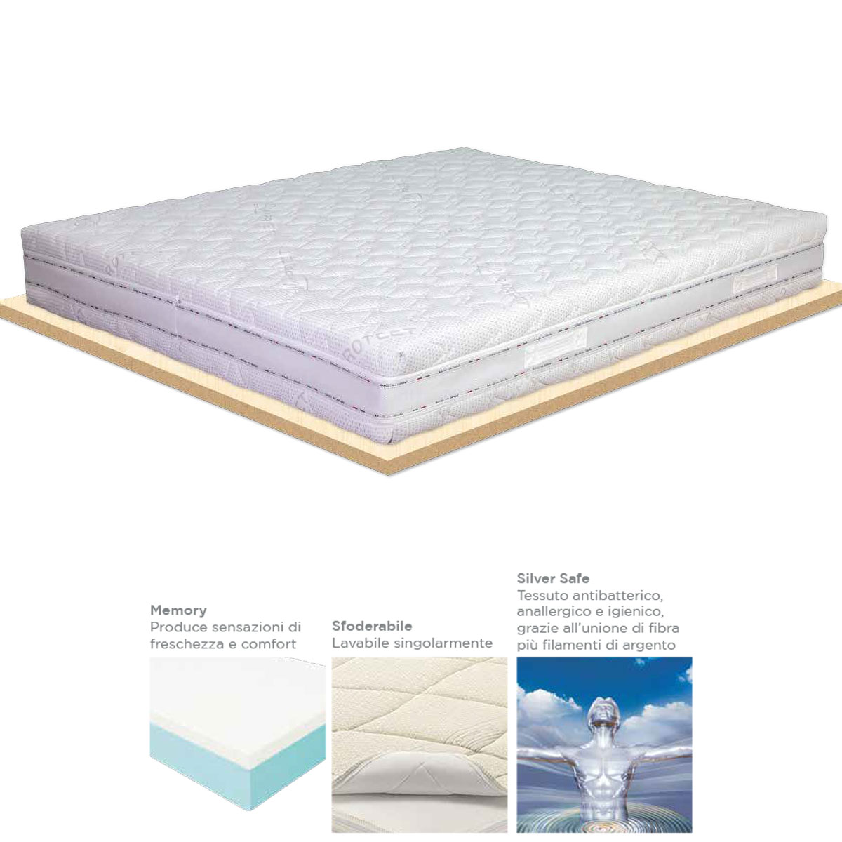 Il materasso è composto da un lato in lenta memoria automodellante, da una lastra centrale in alta densità con funzione di ammortizzatore e dall’altro un lato anatomico in poliuretano. La lastra ha proprietà antiacaro, antibatteriche e antidecubito.