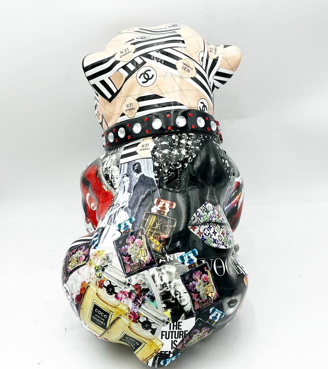 Realizzata con estrema cura, la scultura presenta un mix di texture visive che spaziano dalle strisce zebrate ai dettagli dorati, con richiami evidenti al profumo Chanel N°5, copertine di Vogue e fotografie d’epoca. Il collare con borchie bianche e rosse dona un tocco rock che bilancia perfettamente la raffinatezza del soggetto.