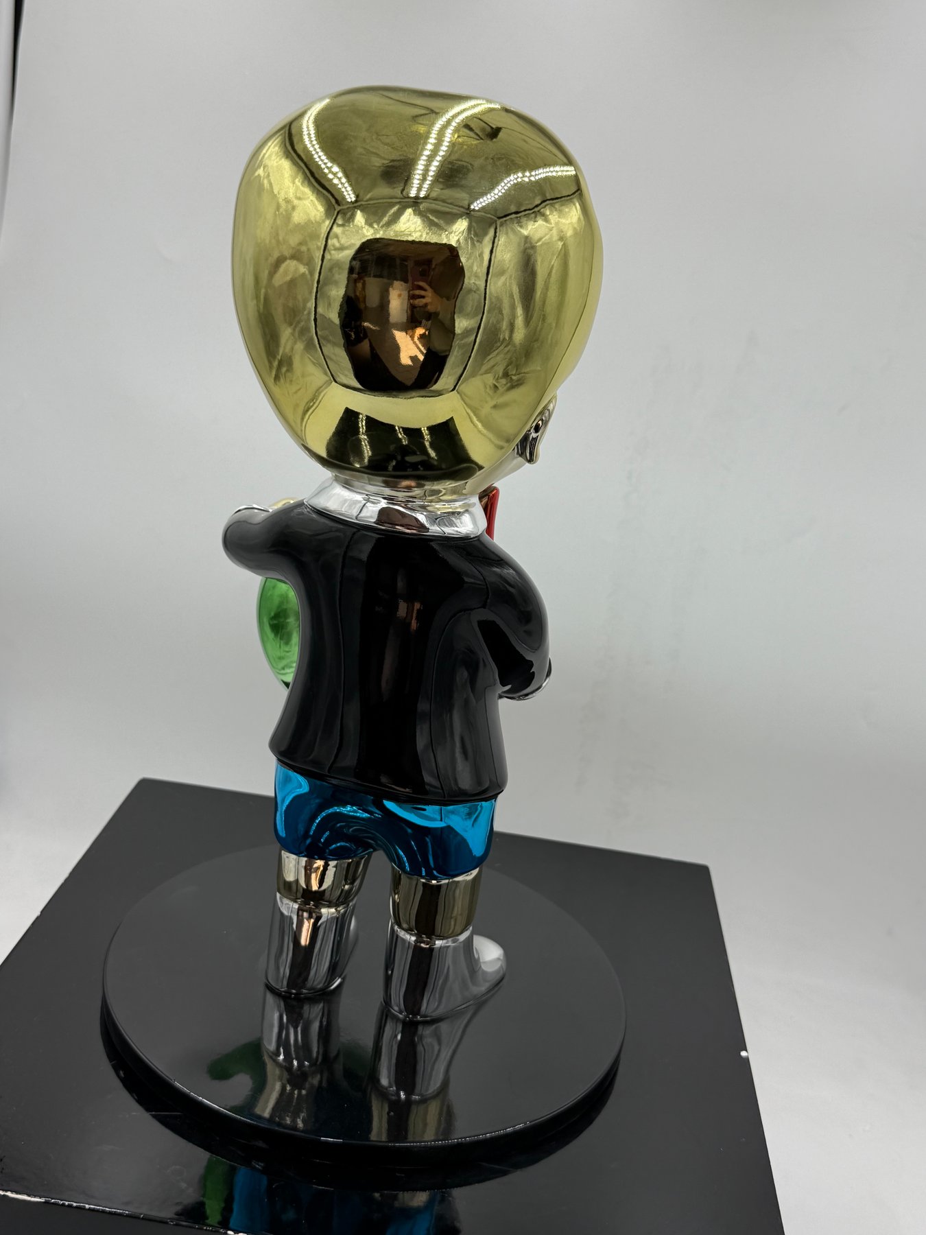 Proprio questo contrasto – tra il tratto infantile del personaggio e la ricercatezza dei materiali – dona all’opera un fascino unico. Inoltre, le superfici riflettenti moltiplicano i giochi di luce, trasformando ogni angolazione in un punto di vista diverso.