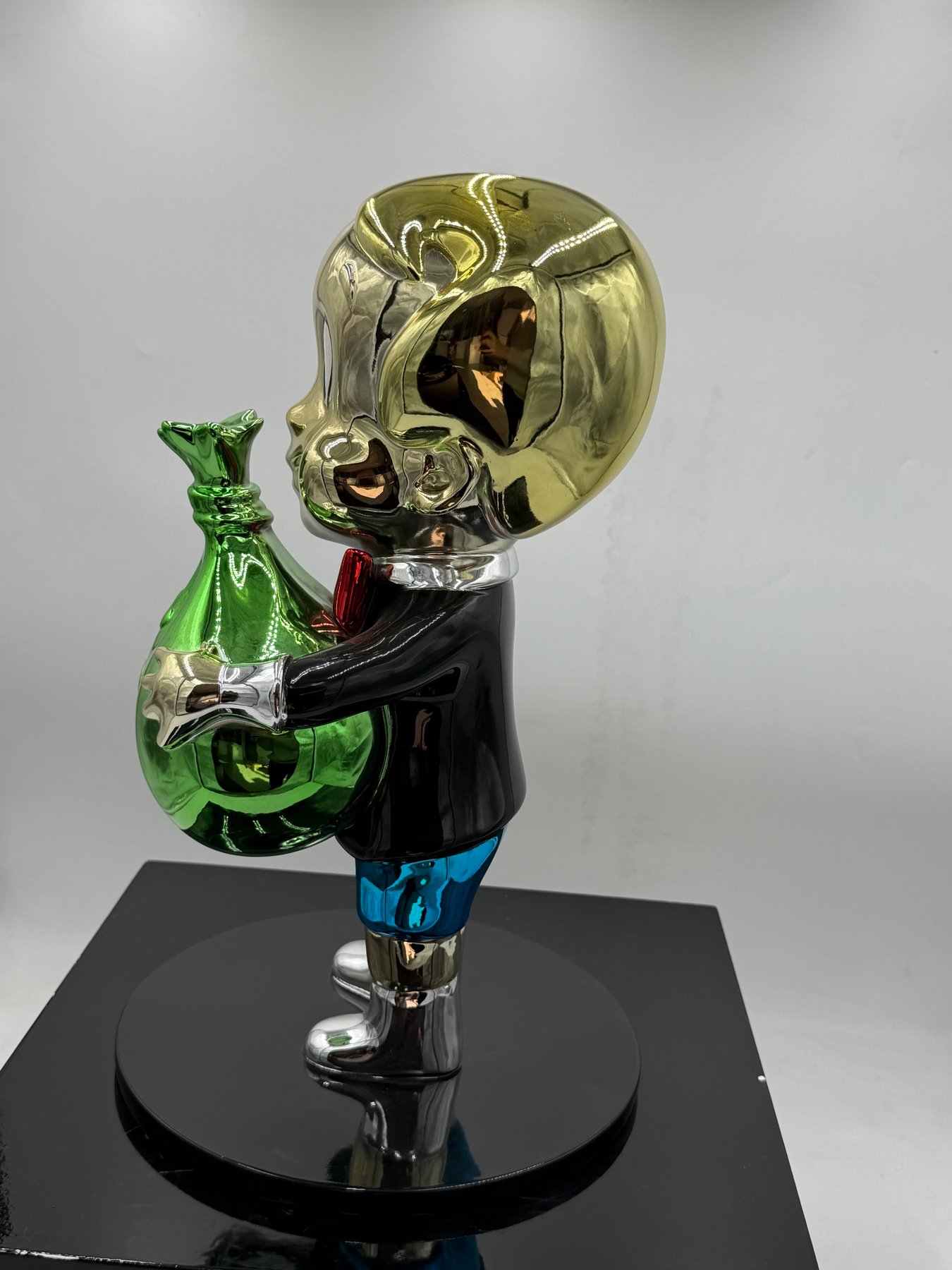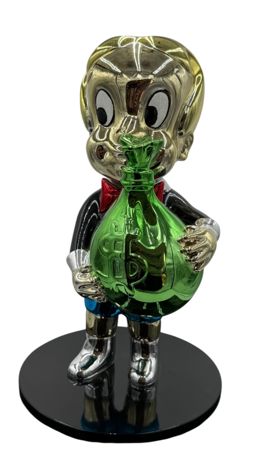 Realizzata con estrema precisione artigianale, la scultura rappresenta Richie Rich mentre stringe tra le mani un sacco di soldi, decorato con il simbolo del dollaro. Un’immagine potente, che diventa subito il centro dell’attenzione in qualsiasi ambiente.