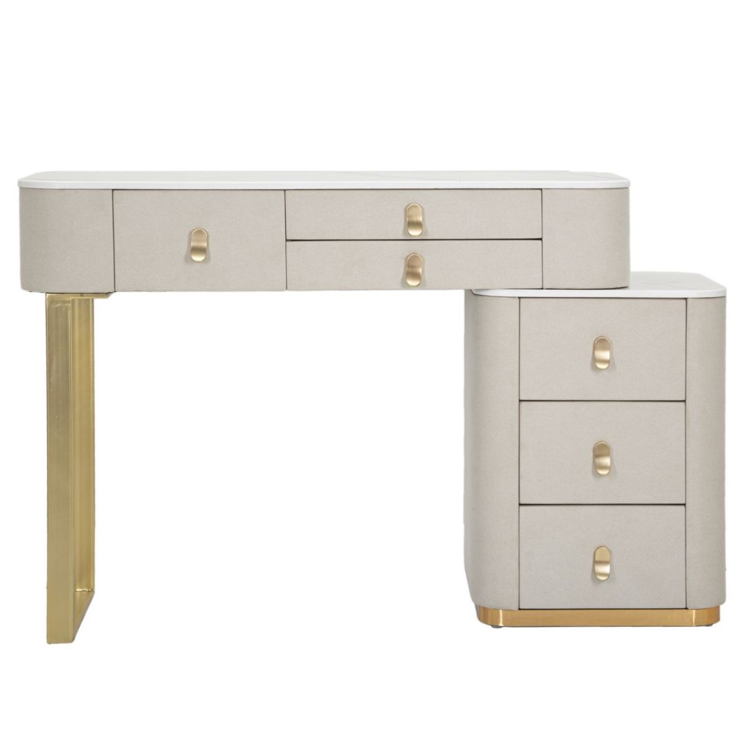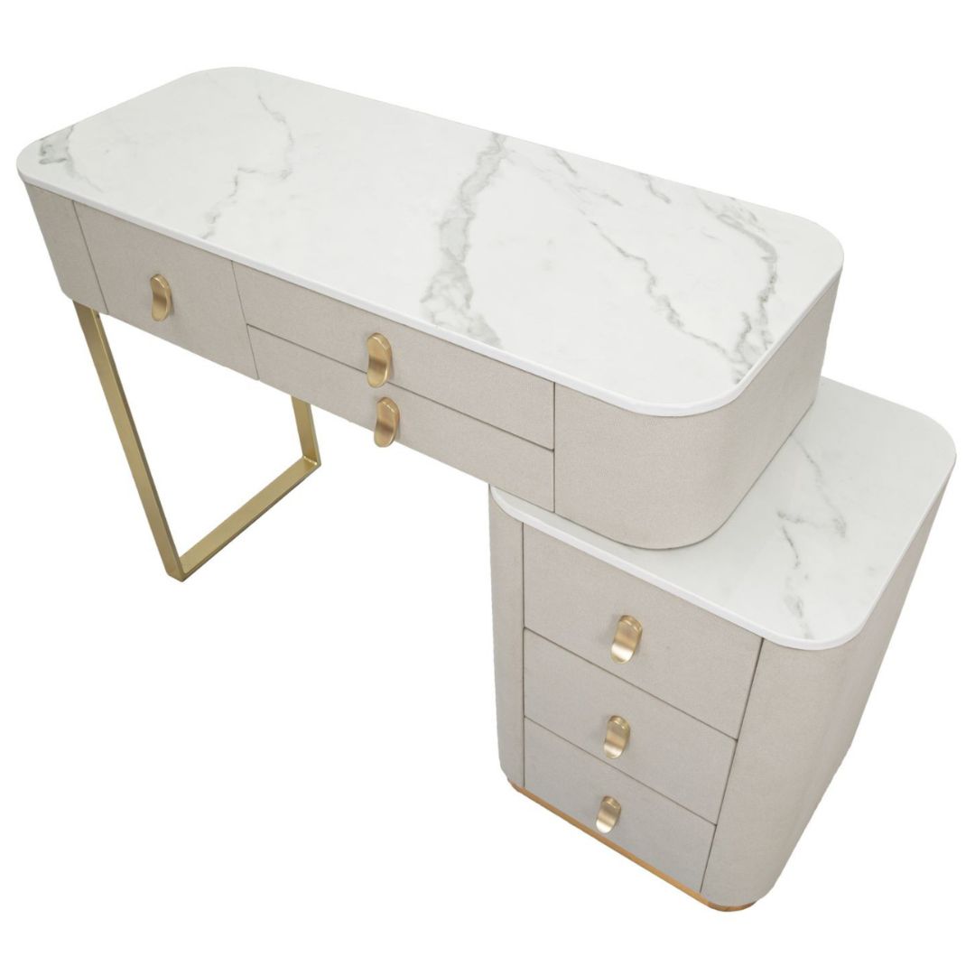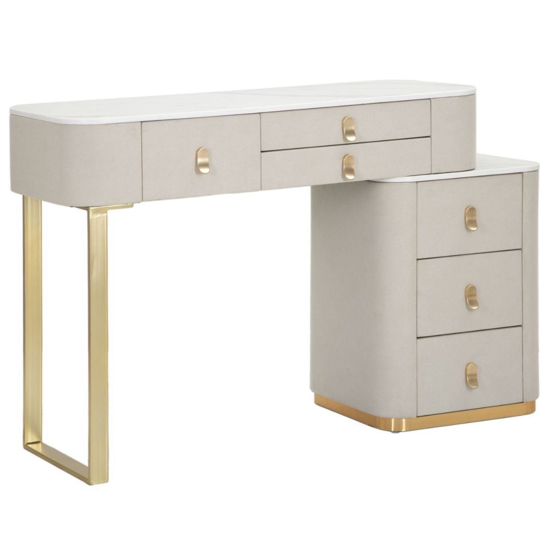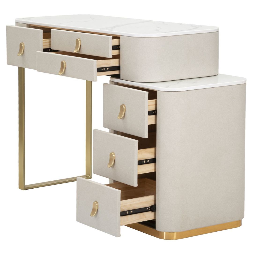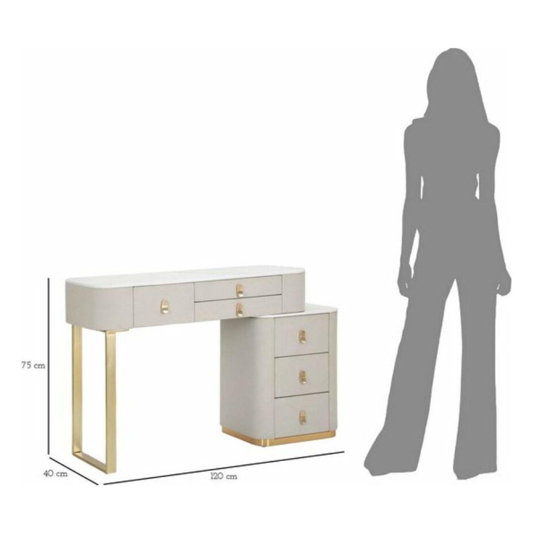 Immagina di iniziare ogni giornata seduta davanti a questa splendida toeletta, avendo tutto ciò di cui hai bisogno a portata di mano. Il design ergonomico e l'ampia superficie del piano in simil marmo offrono lo spazio ideale per posizionare specchi, luci e tutti i tuoi prodotti di bellezza preferiti. La tua routine di trucco diventerà un momento di puro piacere. Adattabile ad ogni stile di arredamento e perfetta anche per salotti; che tu preferisca un look più tradizionale o un'estetica moderna e chic, questa toeletta sarà un'aggiunta armoniosa e di classe al tuo spazio personale.